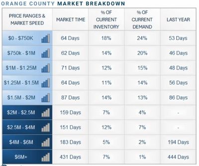 · With supply falling faster than demand, the Expected Market Time, the number of days to sell all Orange County listings at the current buying pace, decreased from 74 to 70 days in the past couple of weeks. The 3-year average before COVID (2017 to 2019) was 87 days, slower than today.